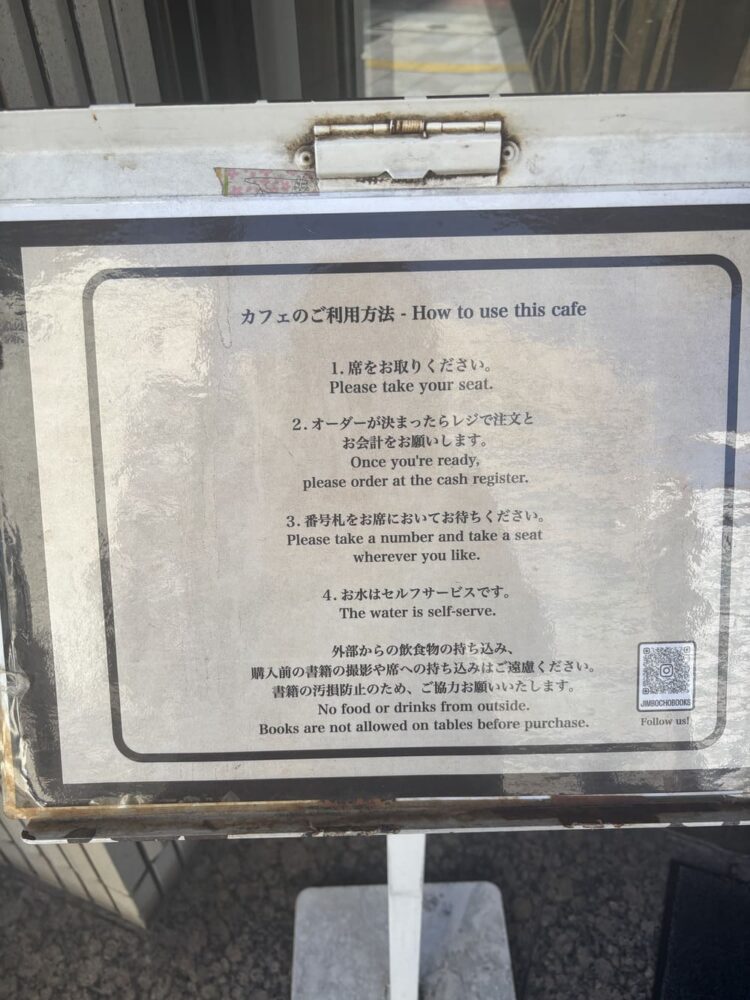 ガラス張りの外観は開放的で、入口の黒板には「ブックセンターカレー」や「コーヒーサンド」などのランチメニューが掲示されており、 本と一緒に軽食やドリンクを楽しめる空間であることが伝わります。