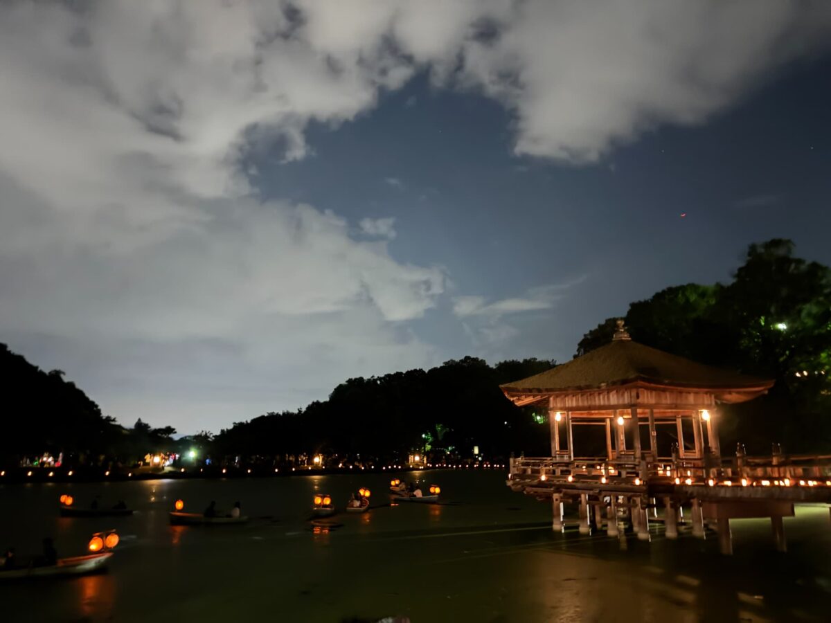 古代奈良を彷彿させる、浮見堂とその周りの池に漂う小舟と縁どるろうそくの灯り。