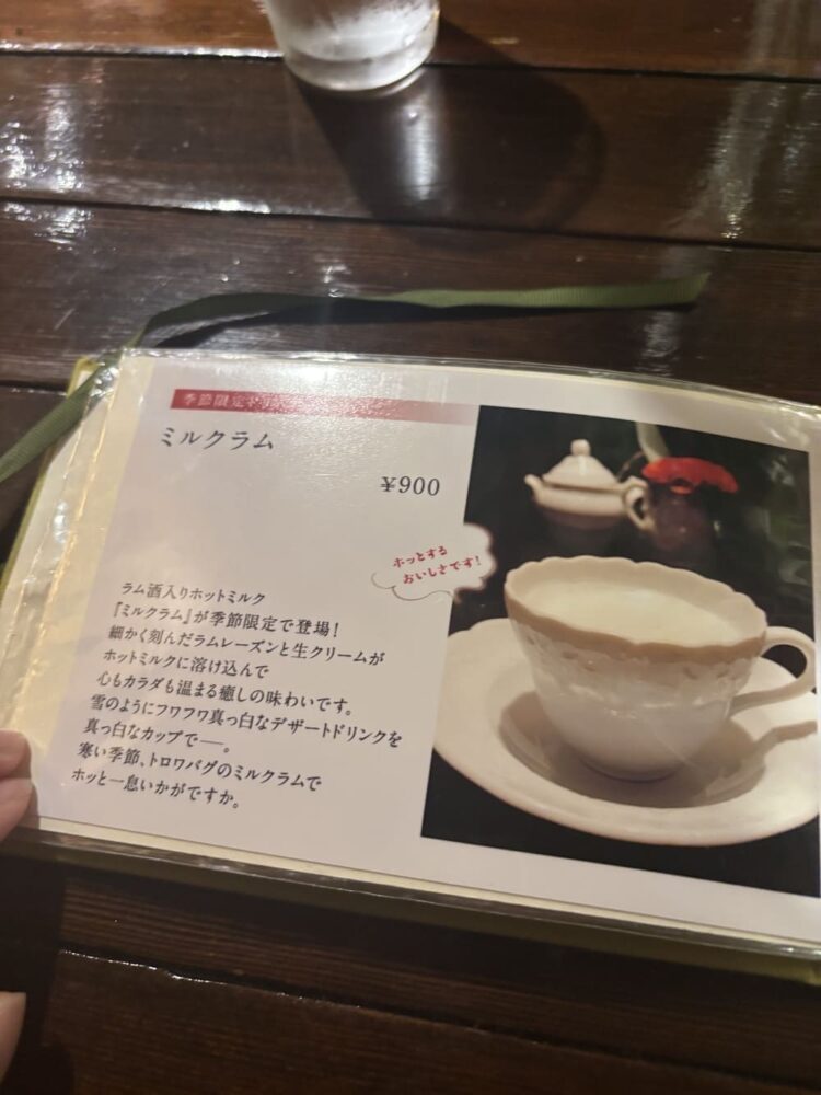 ホットミルクに、刻んだラムレーズンと生クリームがとろりと溶け込んだ、やさしい味わいの一杯です。
