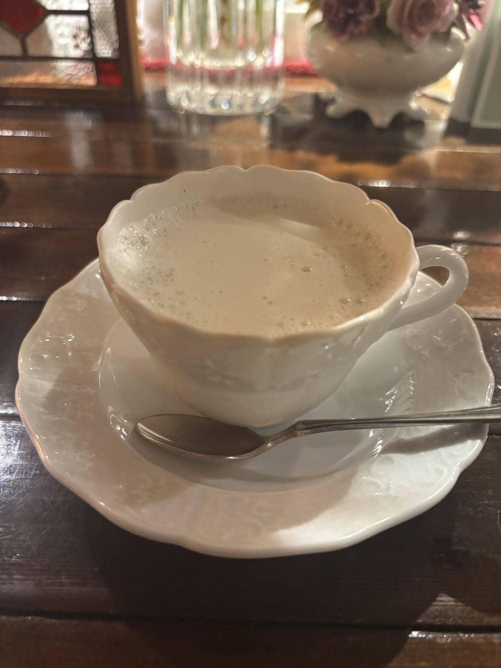 ホットミルクに、刻んだラムレーズンと生クリームがとろりと溶け込んだ、やさしい味わいの一杯です。