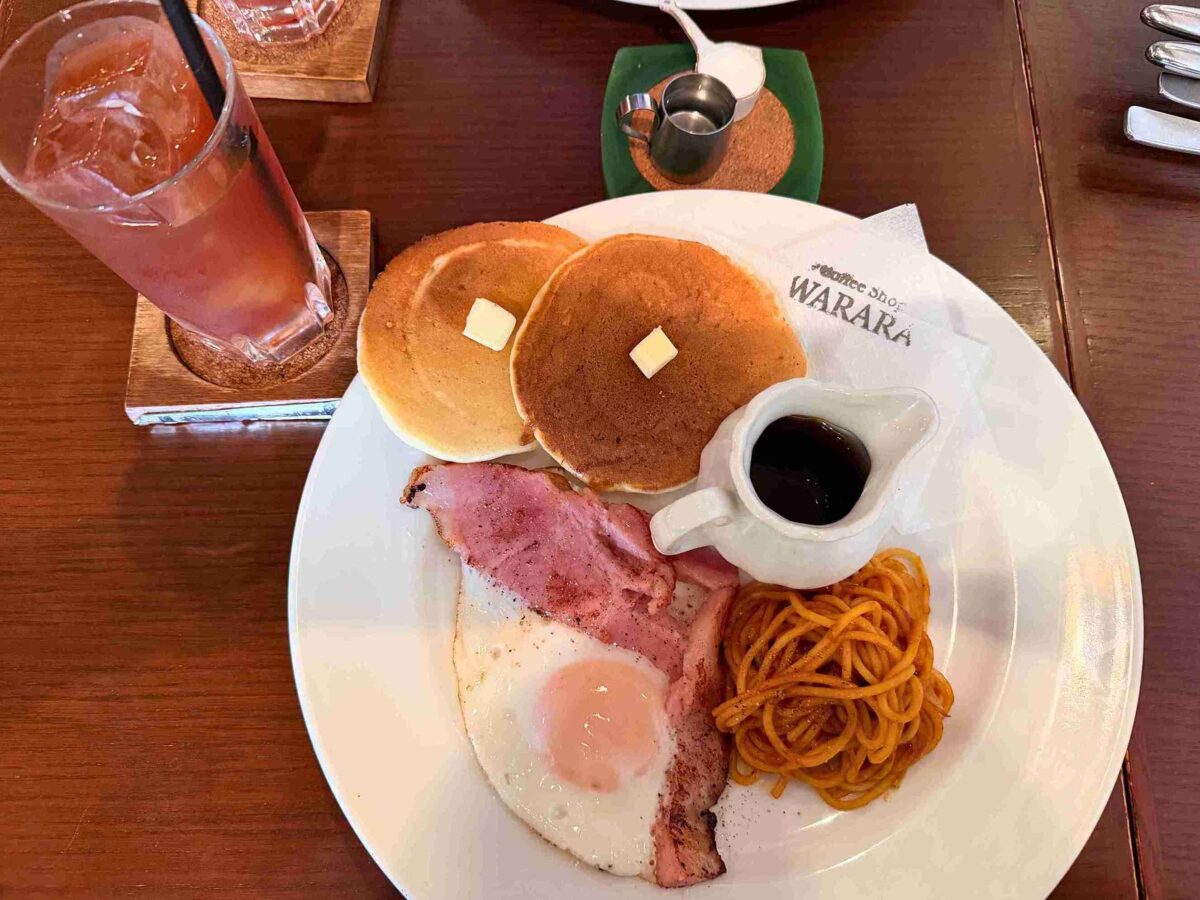 ナポリタン、パンケーキ、目玉焼き、ベーコンといった海外のモーニングのようなプレートです!