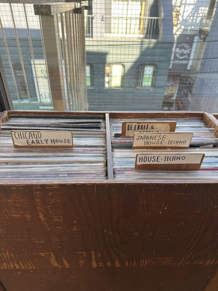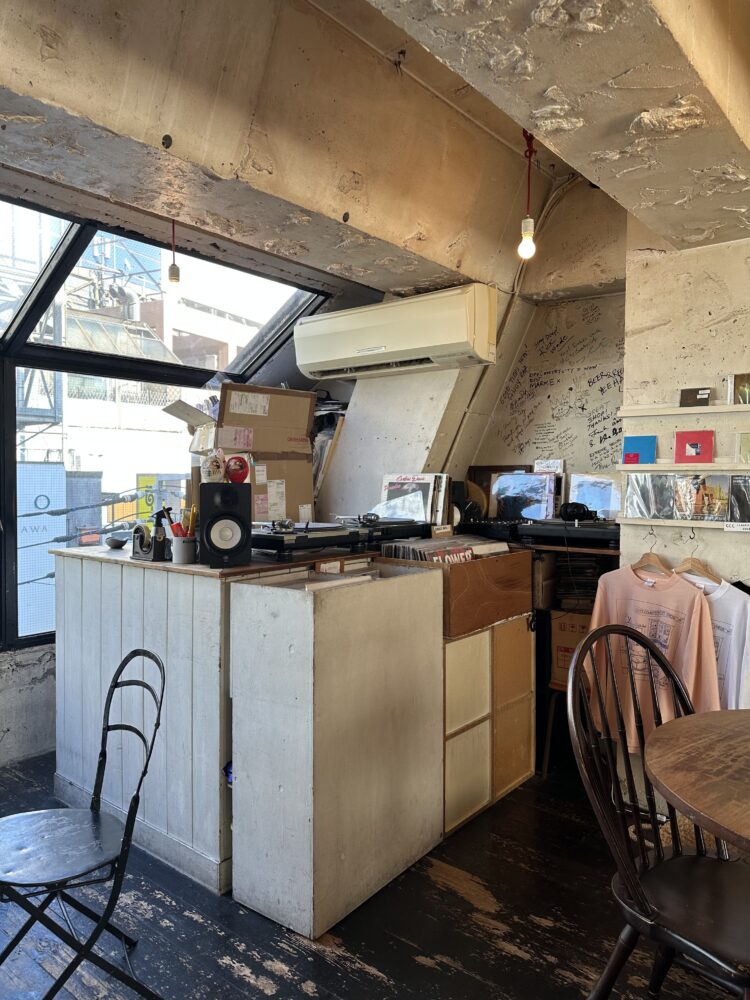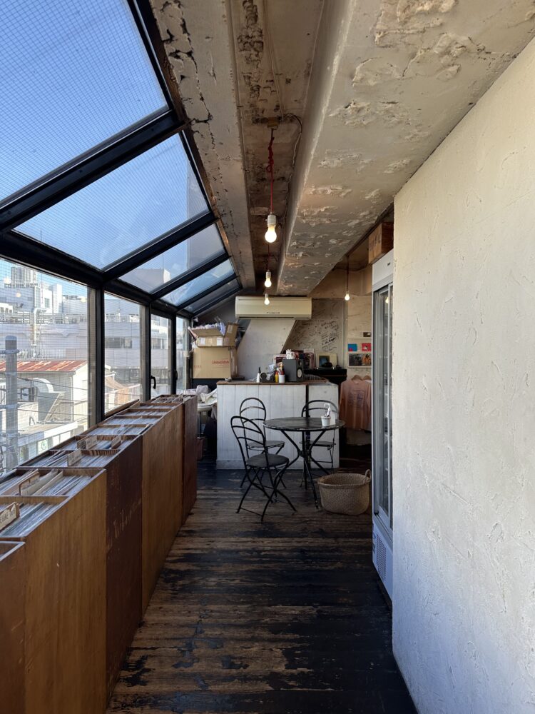 店内に入ってすぐのところにレコードプレイヤーとレコードがあり、