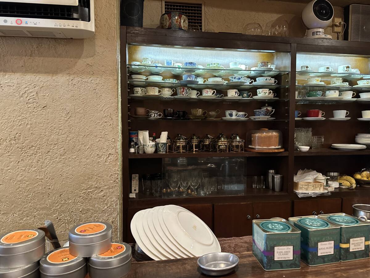 後ろの壁の棚にはティーカップがびっしり並んでいて