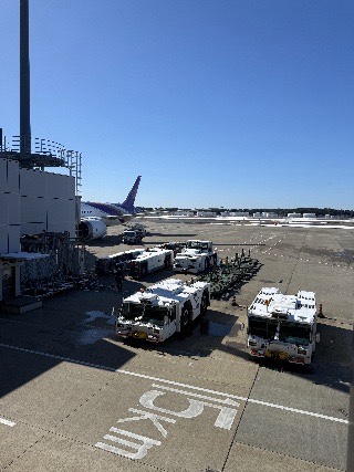 抜けるような青空の下、駐機場で出番を待つ飛行機を見ると、いよいよ日本を離れるのだという実感が湧いてきます〜