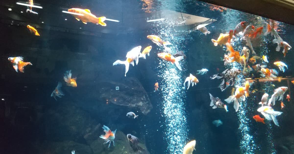 100匹以上の金魚が優雅に泳いでおり、水槽前にはベンチも用意されているので、金魚たちを眺めなが休憩することも出来ます🐟
